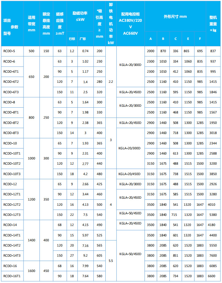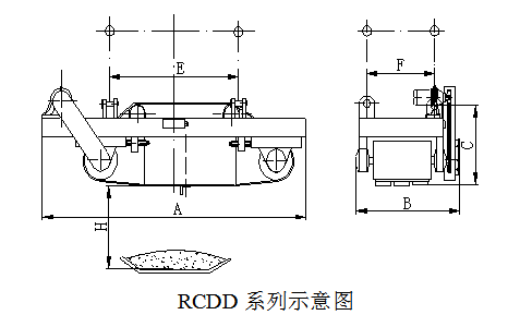 四、RCDD系列懸掛帶式自冷電磁除鐵器主要技術(shù)參數(shù)、外形尺寸 執(zhí)行標準:JB/T7689